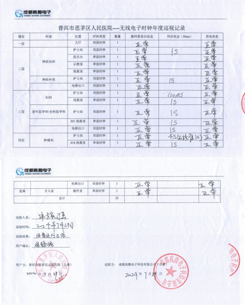 7月29日我公司項目負責人與普洱市思茅區人民醫院(普洱市中心醫院)信息科負責人一同對去年住院三號樓安裝的無線電子時鐘系列進行了逐一的巡視、檢查,并形成書面記錄,形成巡視記錄檔案保存。通過此次巡視檢查,進一步驗證設備的無線接收性能,時間同步精度指標是否在正常的范圍內,保證了醫護人員時刻有標準的時間信息系統參考。